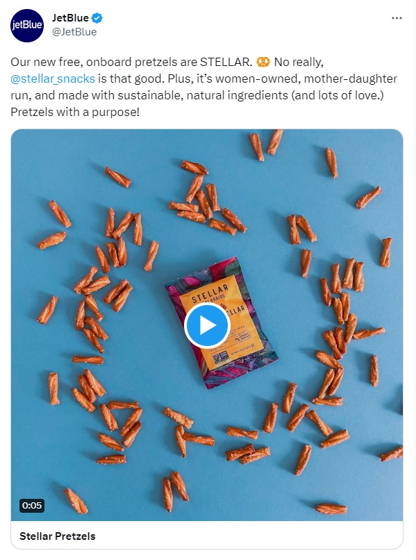For example, Steller Snacks partnered with JetBlue and offered free snacks inflight. JetBlue announced the partnership on Twitter: